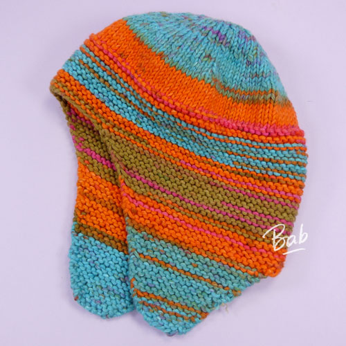 Un petit bonnet cache-oreilles, selon le modèle du catalogue Phildar “Tricotez câlin” 037. Je l’ai adapté avec un reste de coton multicolore.